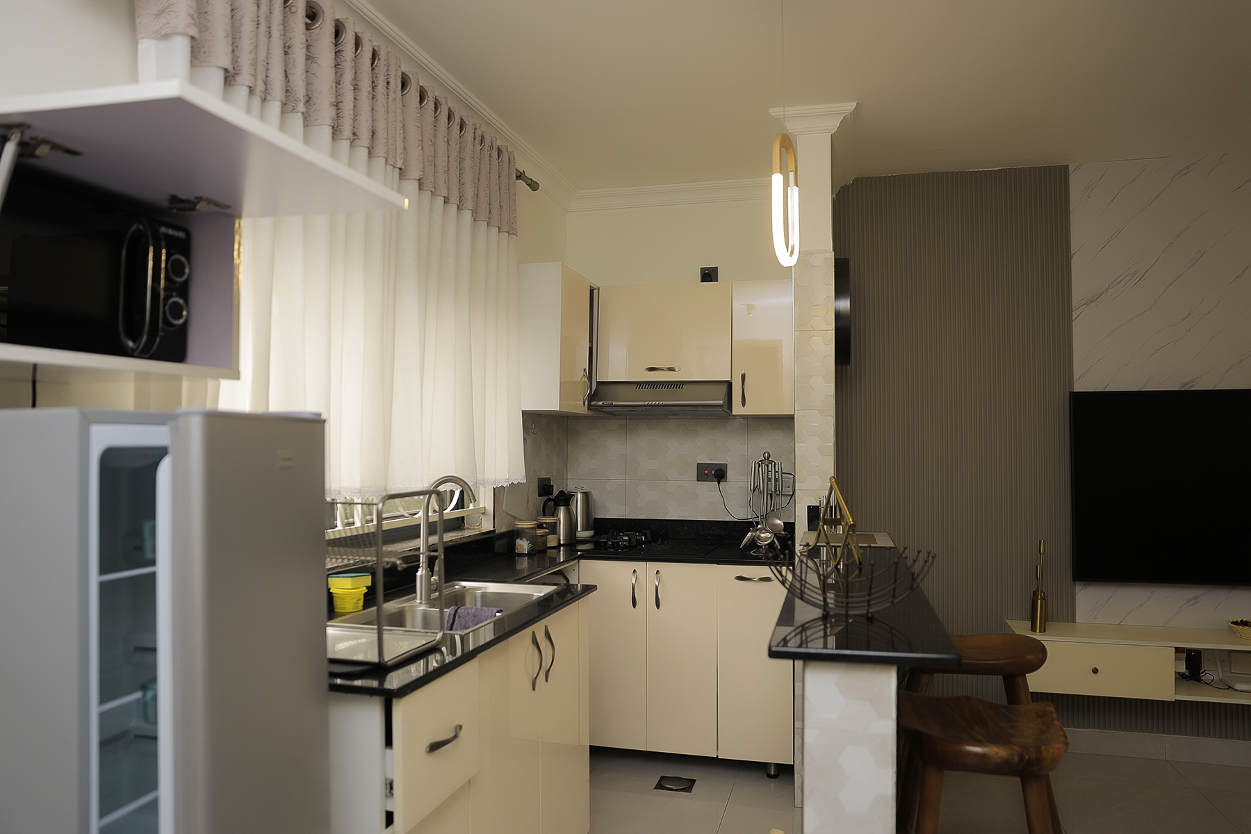 Merinia Properties presents this brand-new, fully furnished 1 bedroom apartment available for short-term daily rental in the quiet and secure neighborhood of Muyenga, located along Kakande Close, approximately 1 km from the main road.